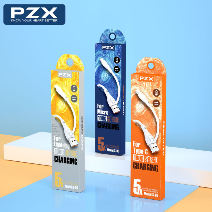 Cables de 1 metro de largo marca PZX modelo S-03 y S-05, ideal para carga rápida y estable de tus dispositivos compatibles. Diseño compacto y duradero en color blanco.